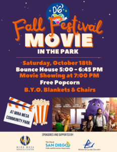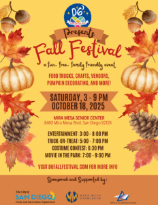 The upcoming D6 Fall Festival will be a FREE family-friendly public event and it will take place at the Mira Mesa Senior Center on Saturday, October 18th 2025, from 3:00 pm – 9:00 pm. The Mira Mesa Senior Center is located on 8460 Mira Mesa Blvd., San Diego, CA 92126.